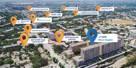 Клиенты компании успели высоко оценить удобное расположение ЖК NRG Mirzo Ulugbek, где на огромной территории посреди шумного мегаполиса будет царить спокойствие и тишина. Это безупречное сочетание уединения от суеты и в тоже время городского комфорта. А хорошая социальная и транспортная инфраструктура, делает ЖК Mirzo Ulugbek от NRG чуть ли не идеальной средой обитания для всех его будущих жителей. В пешей доступности находится: 8 детских садов, 5 школ, 2 вуза, 4 спорткомплекса, 2 парка и 6 медицинских учреждений, рынок, множество кафе, ресторанов, магазинов, аптек и многое другое.