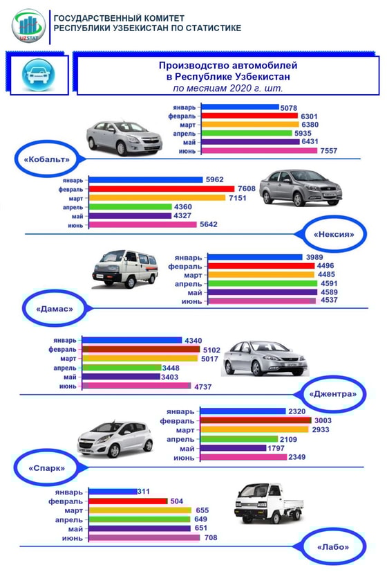 «В автомобильной промышленности в январе-июне 2020 года было произведено 35 050 автомобилей марки «Нексия», 37 682 – «Кобальт», 26 047 – «Джентра», 26 687 – «Дамас», 14 511 – «Спарк» и 3 478 – «Лабо».