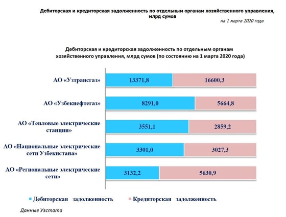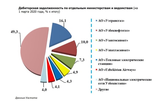 На 1 марта 2020 года – ещё не были введены карантинные мероприятия - наибольшие суммы дебиторской задолженности приходились на предприятия АО «Узтрансгаз» – 13 371,8 млрд сумов (16,1 процента от общей суммы дебиторской задолженности по республике), АО «Узбекнефтегаз» – 8 291,0 млрд сумов (10,0 процентов), АО «Узавтосаноат» – 6 094,3 млрд сумов (7,3 процента), АО «Узпахтасаноат» – 4 070,5 млрд сумов (4,9 процента), АО «Тепловые электрические станции» – 3 551,1 млрд сумов (4,3 процента), АО «Uzbekistan Airways» – 3 447,1 млрд сумов (4,1 процента), АО «Национальные электрические сети Узбекистана» – 3 301,0 млрд сумов (4,0 процента) и АО «Региональные электрические сети» – 3 132,2 млрд сумов (3,8 процента).