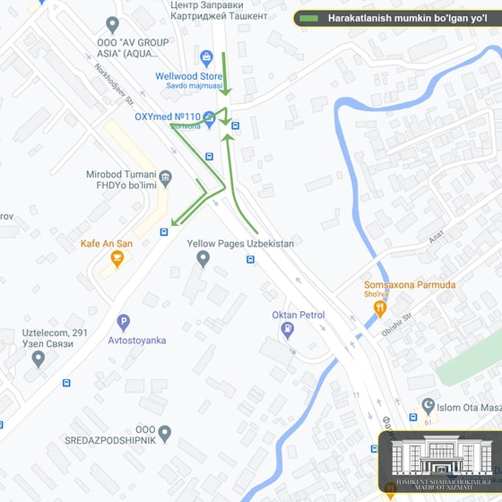 - Прямой проезд по дублирующей дороге от мечети «Ислом ота» в сторону ОАО «Ўзбек қоғози» (бывшая фабрика УзБУМ).