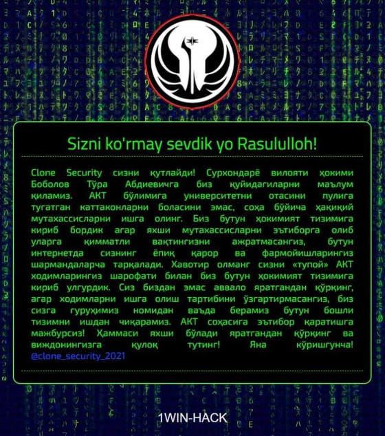 Clone Security приветствует вас! Сообщаем хокиму Сурхандарьинской области Боболову Туре Абдиевичу: нанимайте настоящих специалистов в области ИКТ, а не детей чиновников, окончивших университет на деньги своего отца. Мы вошли во всю систему хокимията. Если вы примете во внимание хороших профессионалов и не будете посвящать им свое драгоценное время, ваши закрытые решения и приказы будут позорно распространяться по всему Интернету. Не волнуйтесь, благодаря вашим «тупыми» сотрудникам в области ИКТ мы уже вошли во всю систему управления, - написали хакеры.