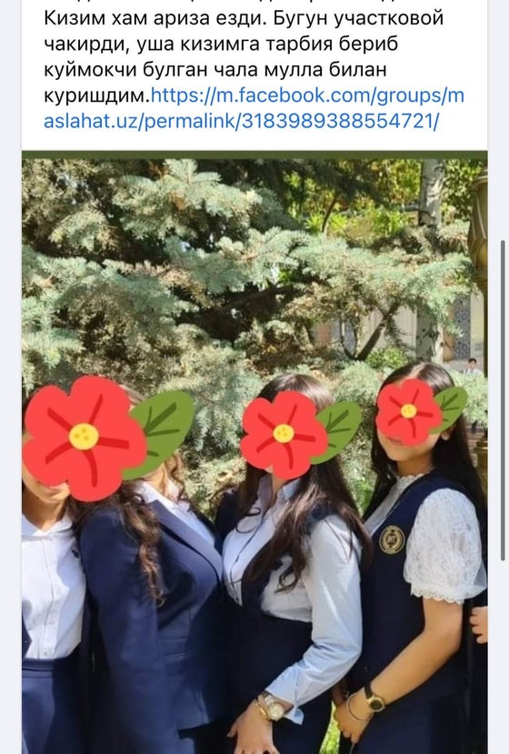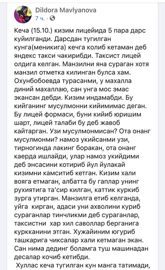 В социальной сети Facebook в группе «Maslahat.uz» женщина рассказала, как «таксист-моралист» допрашивал и осуждал ее дочь, студентку лицея, за внешний вид. Таксист заявил, что девочка была одета не «по-мусульмански».