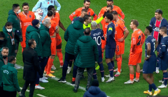 После этого в перепалку с судьями вступили участники обеих команд. На 23-й минуте первого тайма игроки турецкого клуба ушли с поля в раздевалку, отказываясь продолжать матч. Игроки ПСЖ последовали их примеру.