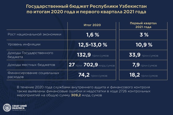 На прошедшем пленарном заседании Сената Олий Мажлиса 28 мая, Кабинет министров отчитался об исполнении государственного бюджета Узбекистана по итогам 2020 года и первого квартала 2021 года.