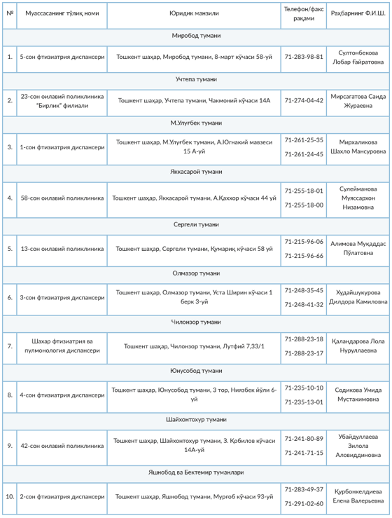 В качестве практической помощи жителям с подозрением на коронавирус, с подтверждённым диагнозом и страдающим от пневмонии в городе Ташкенте организовано 10 cпециальных поликлиник. Об этом сообщил столичный хокимият.