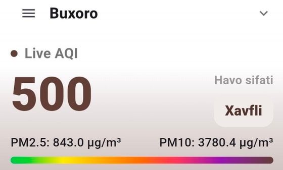 В Бухарской области наблюдаются ветреные условия и пыльный туман. Данные метеорологические условия способствуют повышению концентрации мелкодисперсных частиц PM2,5 и PM10 в атмосферном воздухе, — говорится в сообщении.