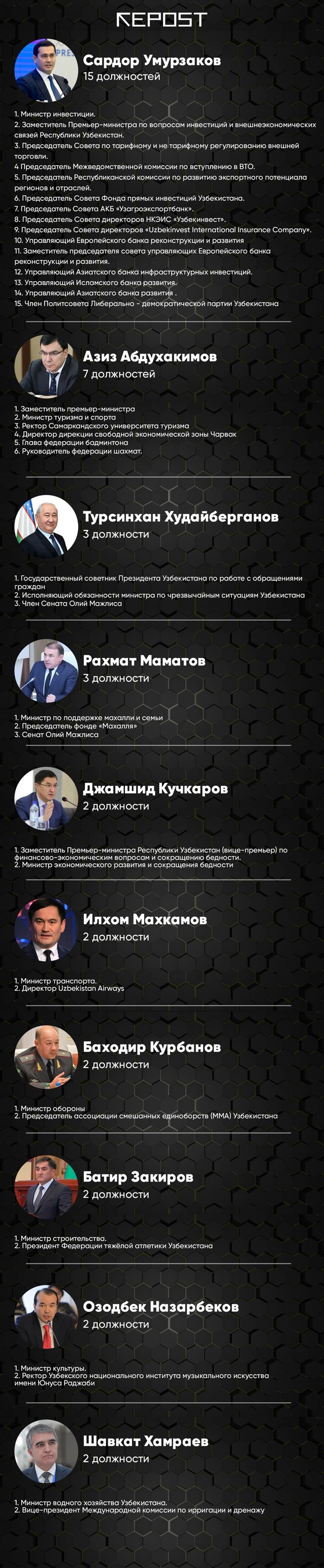 В Узбекистане 24 министерства. Руководители некоторых из них работают в разных должностях одновременно. Repost посчитал в инфографике самых рейтинговых из них по количеству сопутствующих должностей.