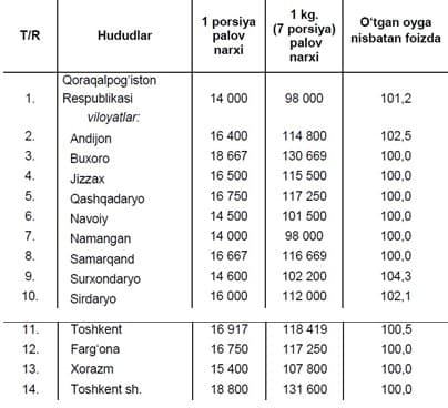 Отмечается, что в процессе сбора данных определялись средние цены, исключительно на отобранных предприятиях общественного питания (центрах плова). Подчеркивается, что цены в ресторанах и чайханах не рассматриваются.