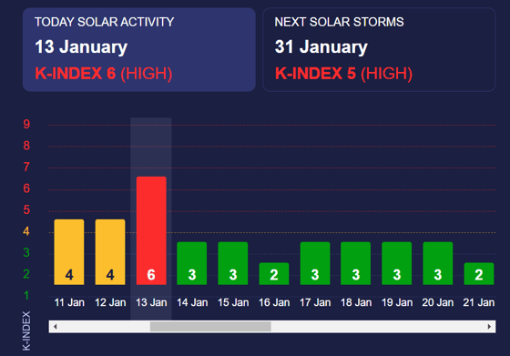 На выходных на Земле наблюдалась «желтая» магнитная буря, которая в настоящее время усилилась до «красного» уровня. Завтра (14 января) показатель должен упасть до минимальных значений.
