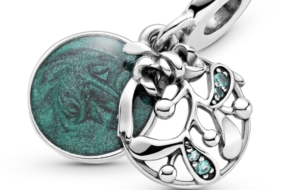 Двойной шарм-подвеску с ажурной омелой украшают четыре аквамариновых кристалла. Два листа омелы декорированы зелеными камнями, а сверху подвески закреплен маленький серебряный бантик. Сквозь ажурную подвеску в виде омелы виднеется зеленая эмаль.