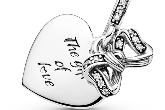 Шарм выполнен в форме подвески в виде сердца и подвески в виде сверкающего бантика. Основание подвески украшено 30 камнями кубического циркония в технике паве. На изделии выгравирована надпись: Дар любви.