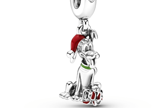 Украшенный алой и зеленой эмалью Плуто тоже надел новогодний колпак и готов к праздникам. Его левое ухо приподнято, язык высунут, и он машет хвостом. Плуто — хороший пёс, который любит дарить подарки своим друзьям. Основание подвески украшено белым камнем кубического циркония.