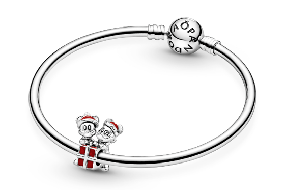 Особенность этого шарма — детализированные рождественские шапочки и подарок с лентой и бантом, подчеркнутые красной эмалью. На Микки надет шарф, а у Минни слегка приподнята правая ножка. На обратной стороне шарма можно увидеть логотипы PANDORA и xDisney.