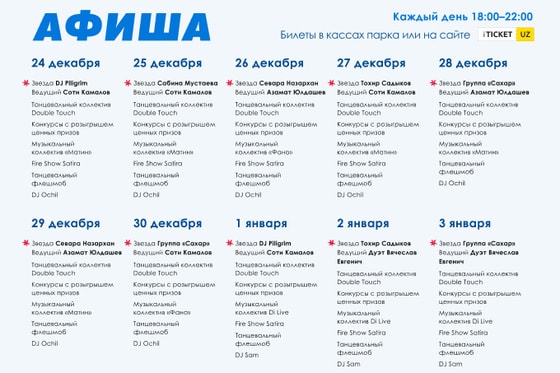 Билет на новогодние каникулы Pepsi New Year Holidays 2021 можно купить онлайн на сайте iTicket.UZ и оффлайн в кассах Central Park.