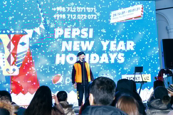 Каждый день Pepsi New Year Holidays 2021 известные ведущие вечера Соти Камалов, Азамат Юлдашев, Дуэт «Вячеслав Евгенич», проводят среди всех гостей мероприятия и розыгрыши ценных призов от партнеров MacCoffee, Hillway, Erkatoy, FDG, Asia Luxe, Layner, Go'sht.