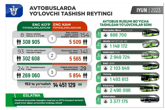 В июне самым непопулярным автобусным маршрутом в Ташкенте стал №154. Об этом сообщает пресс-служба «Тошшахартрансхизмат».
