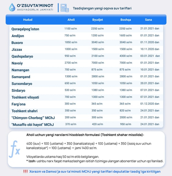 Согласно новым тарифам, новые цены на услуги питьевой воды и канализации в Узбекистане выросли в среднем в 1,9 раза. Расчеты для потребителей, не обеспеченных водомерами, рассчитываются исходя из нормативов потребления воды.