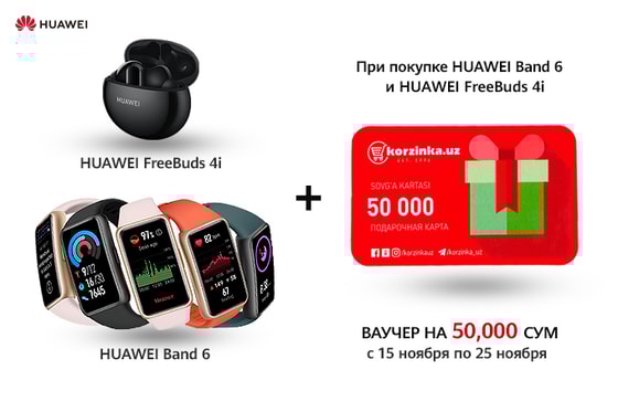 С 15 ноября по 25 ноября, приобретая Huawei Band 6 или Huawei Freebuds 4i, вы получаете ваучер на 50 000 сум от Korzinka. Акция действует во всех филиалах магазинов Elmakon, Mediapark, а так же в онлайн-магазинах Olcha, Asaxiy и Zoodmall.