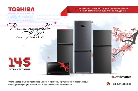 Учитывая жаркие летние месяцы в Узбекистане, и в целях широкого распространения холодильников марки Toshiba, в апреле и мае стартовала акция «Весна подарков от Toshiba».