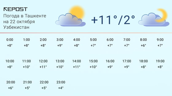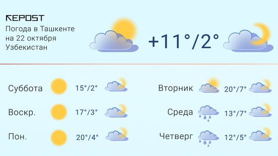 В Узгидромете предупредили о вторжении на территорию Узбекистана холодных и влажных воздушных масс 21 и 22 октября. В Ташкенте и за его пределами местами ожидаются осадки в виде дождя и снега, с ухудшением видимости и усилением ветра. На ближайшей неделе ожидается понижение температуры воздуха днем до +8…+13 градусов тепла, ночью до -2…+3 градусов.