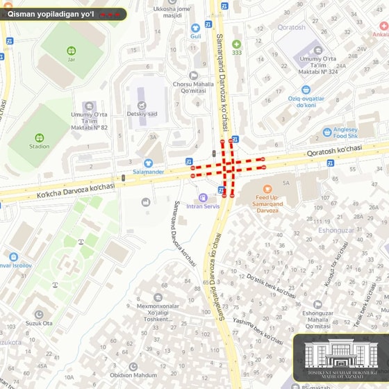 На этом перекрестке и выходящих на него улицах (Самарканд Дарвоза, Кукча Дарвоза, Караташ) поэтапно будут проведены ремонтные работы.