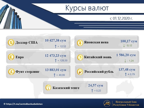 Центральный банк Узбекистана установил новые курсы иностранных валют по отношению к суму. Курс доллара составил 10 427,38 (+12,52) сумов, а евро 12 473,23 (+128,50) сума.