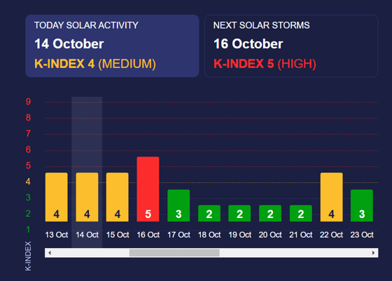 Геоудары также прогнозируются завтра и послезавтра, 16 октября они усилятся до K-индекса 5. Ситуация стабилизируется 17 октября.