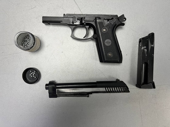 В результате досмотра они обнаружили пневматический пистолет и 290 пуль из стали для стрельбы, незадекларированные в соответствии с установленным порядком для таможенного контроля, и не имеющие соответствующего разрешения.