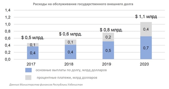 При этом - по данным Центрального банка - основным источником финансирования дефицита счета текущих операций в прошлом году стало привлечение внешнего долга от международных финансовых институтов. Регулятор отмечает, что в течение 2017–2019 годов расходы на обслуживание внешнего долга страны возросли в 1,4 раза (с 1,9 млрд долларов до 2,7 млрд долларов). Объём выплат по государственному внешнему долгу увеличился за 2017-2020 годы в 2,2 раза (с 465 млн долларов до 1,1 млрд долларов).
