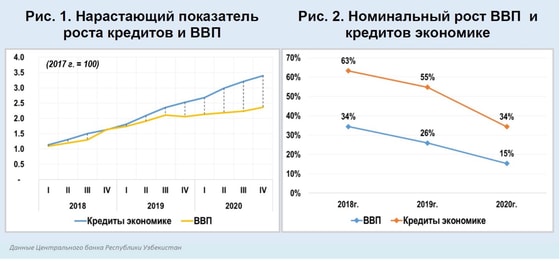 По данным ЦБ Узбекистана за последние три года объёмы кредитования реального сектора увеличились почти 3,5 раза. Однако, несмотря на бурный рост кредитования и развитие кредитных отношений, вклад предоставляемых кредитов в экономический рост страны остаётся незначительным. Это видно при сопоставлении прироста номинального валового внутреннего продукта с приростом остатков кредитов экономике.
