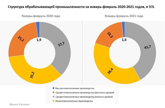 При этом в отечественной промышленности доля высокотехнологичных производств в январе-феврале 2021 года достигает всего 1,6 процента. При этом, наблюдается снижение этого показателя: в январе-феврале 2020 года он составлял 1,9 процента.