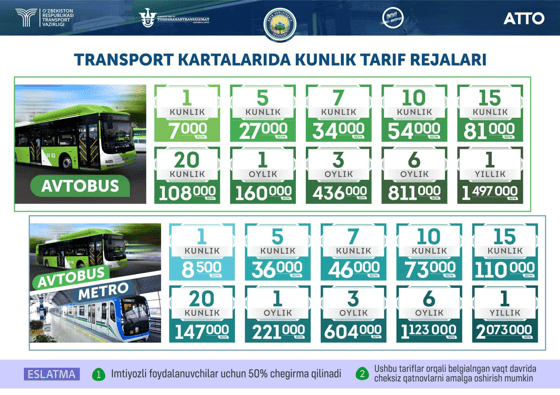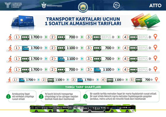 Пассажиры, пользующиеся транспортными картами АТТО, будут платить 700 сумов при пересадке в течение часа с одного автобуса на другой. Третья и четвертая пересадки будут бесплатными.
