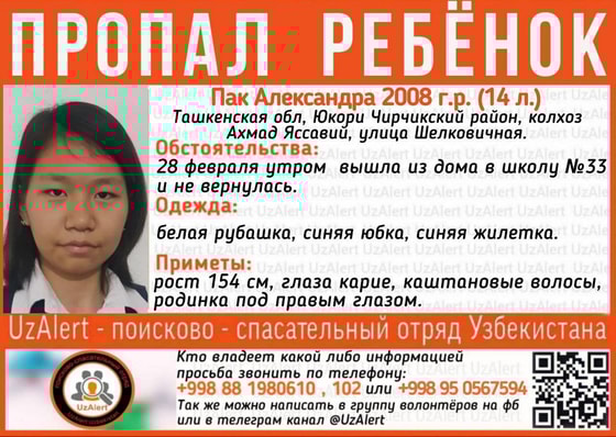 Согласно данным, 28 февраля домой не вернулась 14-летняя Александра Пак. Утром девочка отправилась в школу №33. На ней была белая рубашка, синяя юбка и синяя жилетка. Её рост составляет 154 см, глаза карие, волосы каштановые, имеется родинка под правым глазом.