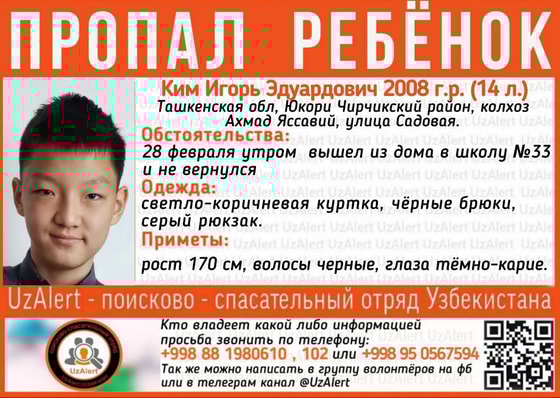 В тот же день пропал 14-летний Игорь Ким, вышедший утром в школу №33. Мальчик был одет в светло-коричневую куртку, черные брюки, также у него был серый рюкзак. Его рост 170 см, волосы черные, глаза тёмно-карие.