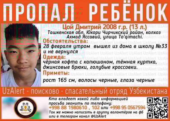 Помимо этого, пропал 13-летний Дмитрий Цой. Мальчик также утром вышел в школу №33 и не вернулся. На нем была черная кофта с капюшоном, темная куртка, джинсовые брюки и голубые кроссовки. Рост ребенка 165 см, у него черные глаза и волосы.