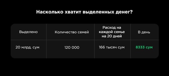 Из выделенных денег 120 тысяч семьям достается в среднем 8333 сум в день. В 2019 году ЮНИСЕФ сообщало, что 76% населения Узбекистана проживает менее чем на 15,7 тысячи сумов в день. Отмечается, Узбекистан израсходовал $6,1 млрд для смягчения последствий пандемии.