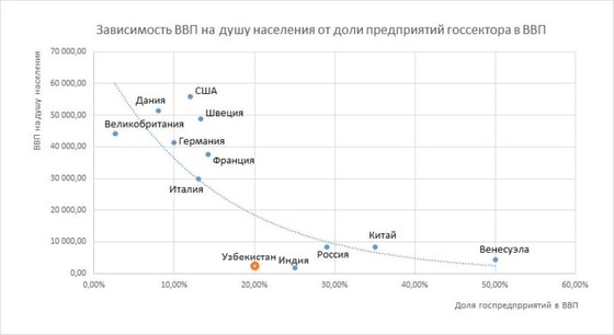 Небольшая, но показательная выборка. Конечно, наивно было бы делать вывод о том, что доля государственного сектора полностью предопределяет уровень развития экономики. Скорее, совокупность культурных, исторических и субъективных факторов формирует модель экономики, которая характеризуется указанной зависимостью размера валового внутреннего продукта на душу населения и доли госсектора в хозяйственной деятельности.