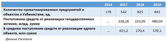Особенно смешно выглядит обоснование, что собственник приватизированного имущества будет заинтересован в наиболее эффективном его использовании. Целые отрасли после приватизации («Махаллий саноат» (местная промышленность), «Узбытсоюз» (бытовое обслуживание населения), «Узбексавдо» (государственная торговля), «Узбекбрляшу»(потребительская кооперация), а также крупные предприятия канули в Лету.