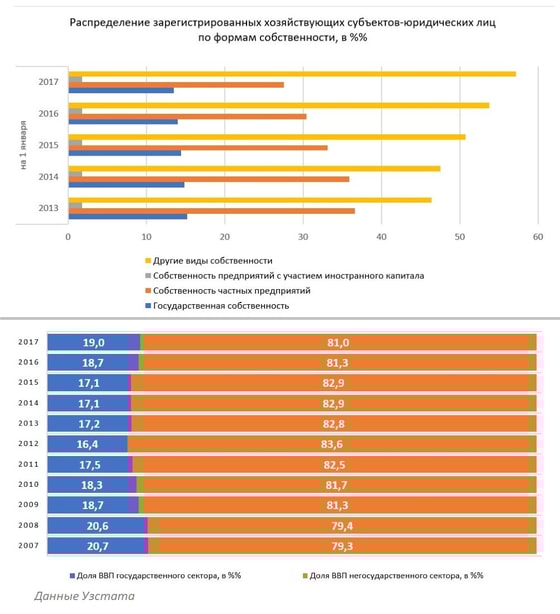 При этом доля валового внутреннего продукта страны, произведённого государственным сектором по данным Узстата, составляет около 20 процентов. Много это или мало? Всё познаётся в сравнении.