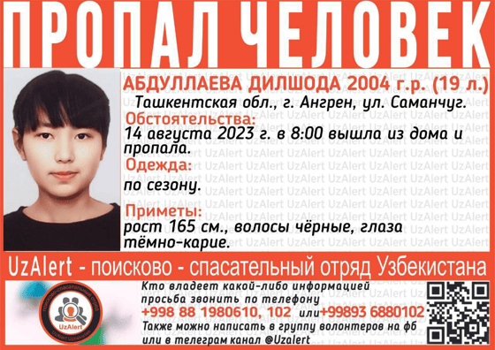 Граждане, владеющие какой-либо информацией о разыскиваемой девушке, могут обратиться по номерам 102, +998881980610 или +998936880102. Также можно написать в группу волонтеров UzAlert.