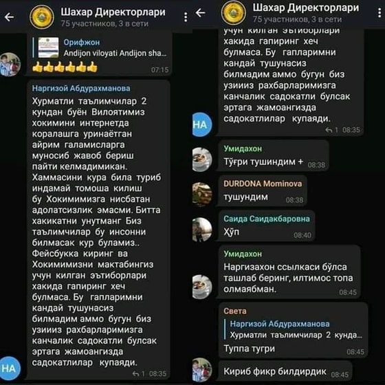 Напомним, ранее в сеть выложили аудио хокима Андижанской области, где он раскритиковал журналистов и рассказал об аресте трёх женщин за «грязные слова» на 15 суток.