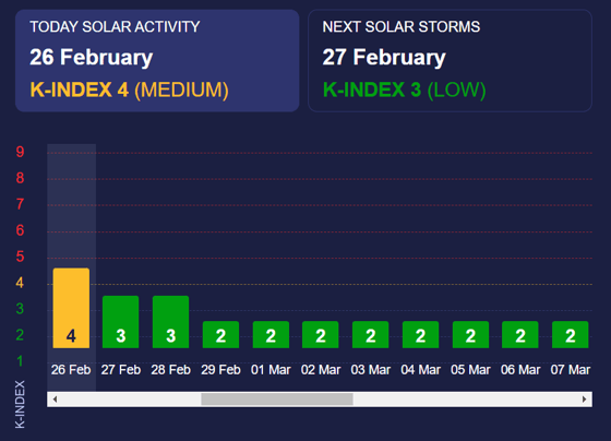 В ближайшие дни геомагнитный показатель опустится до нормальных значений.
