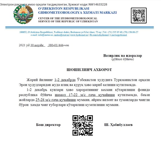 Напомним, 4 ноября на Узбекистан обрушились пыльные бури. Тогда пыльные бури снесли крышу здания хокимията Пешкунского района. По наблюдениям, проводимым «Узгидромет», такого не наблюдалось 150 лет.