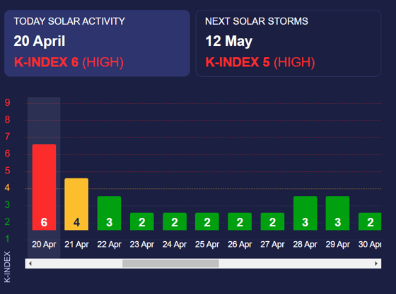 Сегодня (20 апреля) на Землю обрушилась магнитная буря красного уровня (K-индекс 6), сообщает Meteoagent.