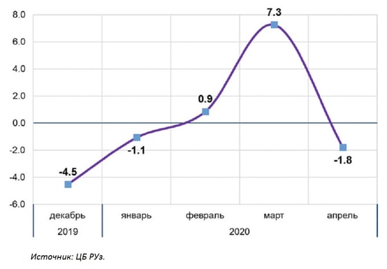 В апреле 2020 года снова произошла девальвация обменного курса на 5,8 процента. Причина та же: ослабление валют основных торговых партнёров Узбекистана.