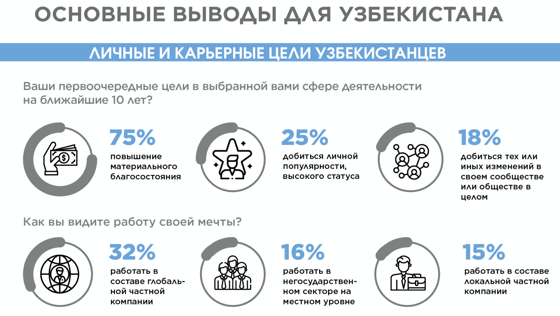Отмечается также, что 18% граждан Узбекистана хотели бы добиться изменений в обществе. Для сравнения в Украине, этот показатель составляет 35%, а в Грузии – 13%. Наибольший процент жителей Узбекистана – 32% – выразили желание работать в международной частой компании. Еще 11% мечтают об открытии собственного дела. При этом на работе жители Узбекистана готовы принимать минимальное количество решений, а большую часть свободного времени уделять друзьям (33%).