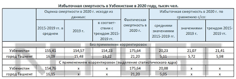 Можно долго спорить на тему скрывают ли у нас смертность от COVID-19 или нет. Но вот данные Узстата, которые свидетельствуют о том, что избыточная смертность в стране в 2020 году составила около 21 тысячи человек, в том числе в Ташкенте – в зависимости от применяемого метода расчёта – от 5 до 6 тысяч человек.