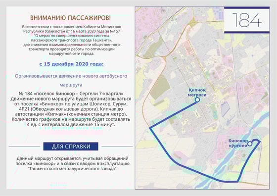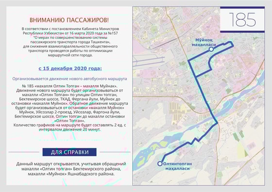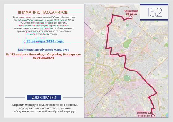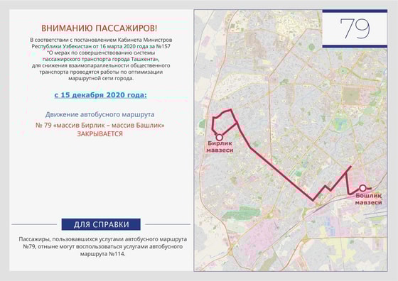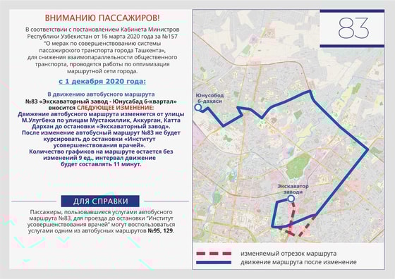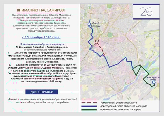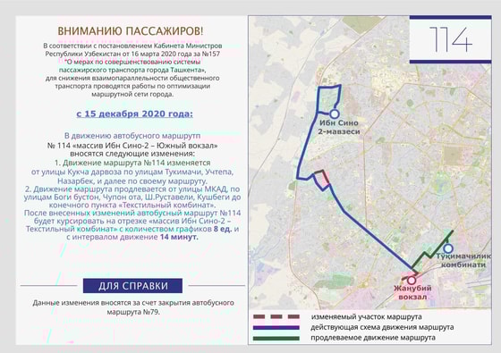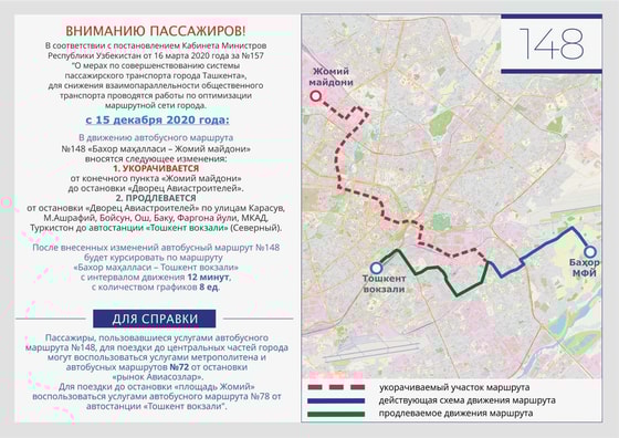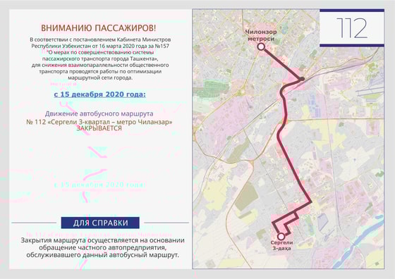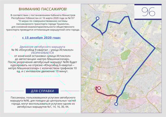 С 15 декабря этого года в Ташкенте планируется оптимизировать десять автобусных маршрутов — № 26, 79, 83, 96, 112, 114, 148, 152, 184, 185. Об этом сообщила пресс-служба «Тошшахартрансхизмат».