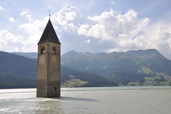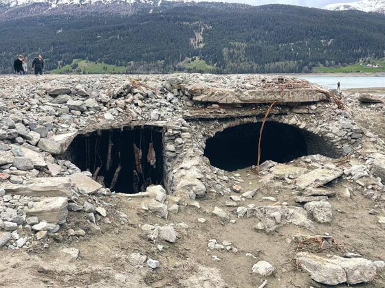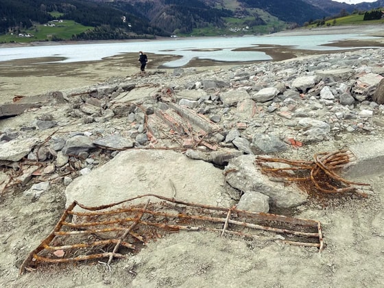 На искусственном озере Резия проводятся ремонтные работы, в результате которых его временно осушили. На дне обнаружили затопленную деревню Курон.