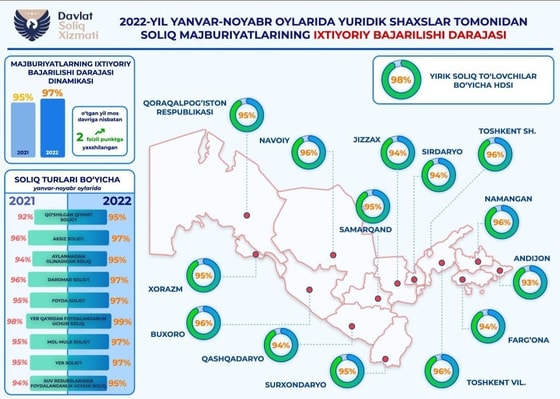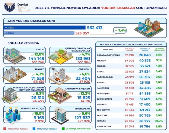 Количество налогоплательщиков среди юрлиц в Узбекистане увеличилось на 7,4% с начала года по состоянию на 1 декабря 2022 года, говорится в Телеграм-канале ГНК Fiskal tahlillar. Общее количество юридических лиц достигло показателя 562,4 тысячи. Рассматривая эти цифры в разрезе отраслей, самые высокие темпы роста показали: